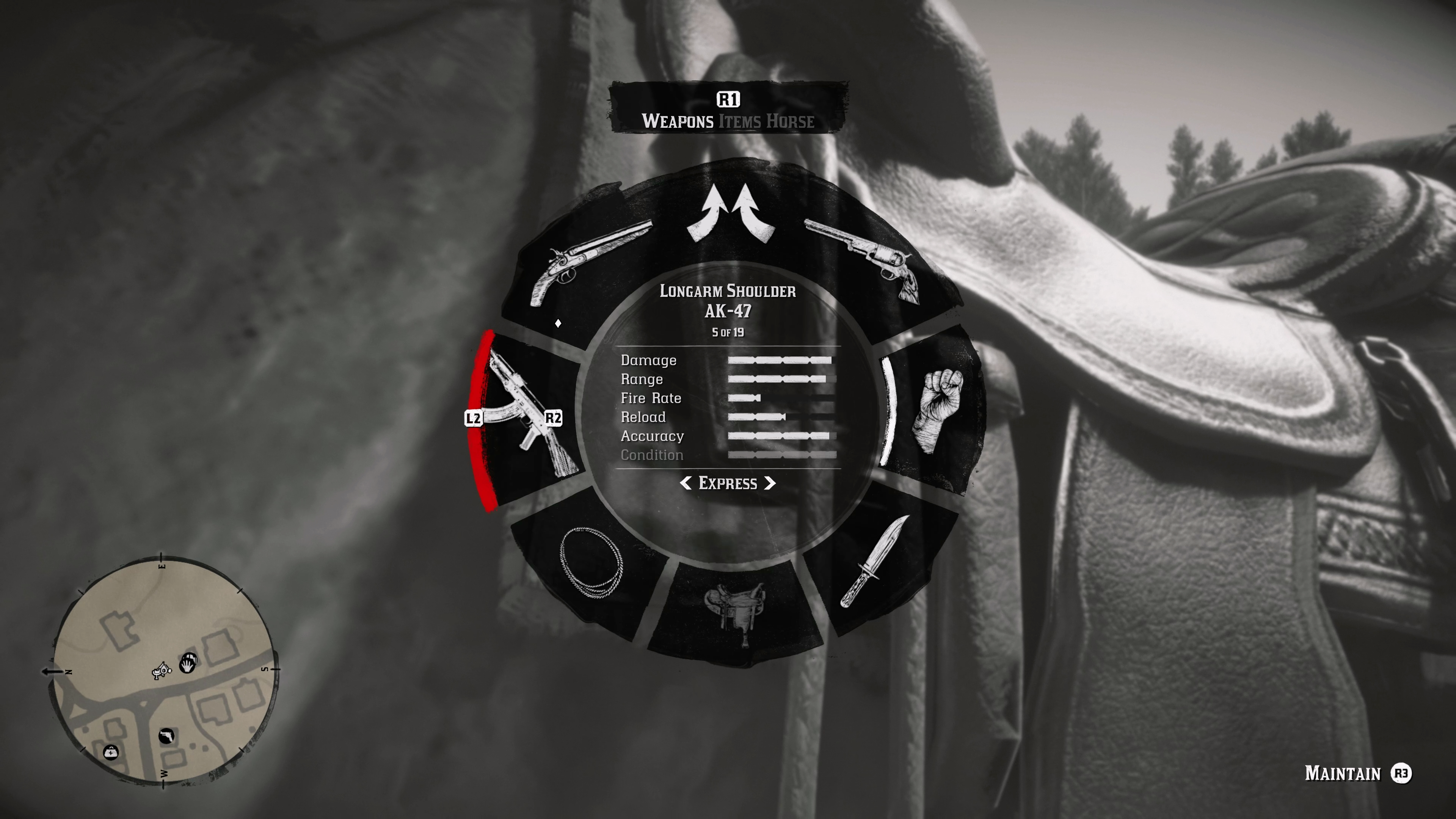 무기는 '총포상'에서 구매할 수 있습니다. Rampage 트레이너를 사용하시는 분은 거기서 얻으셔도 되고요. 획득 후에는 무기 휠에서 AK-47을 선택할 수 있습니다.